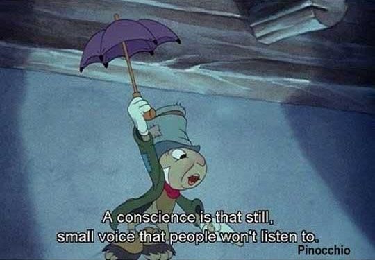 A conscience is that still, small voice that people won't listen to.- Pinocchio